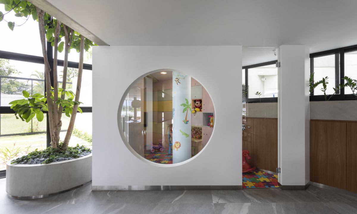 The house is located in Brasilia and is structured on three floors. All the interior walls have been removed from the section of the house facing the lake. This is where the kitchen, the dining area and the living room are. There’s also a cute little playroom with a round window on this level. The flooring seamlessly extends outside creating a close bond with the poolside deck and the lake. The second level is the one facing the street and there’s also the third level where all the private spaces are. This one is suspended and has a triangular plan.