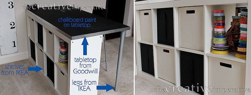 Who knew that a couple of filing cabinets and a giant plank of wood can be combined to create a craft table that offers plenty of work surface! This is a DIY project that pretty much anyone can try out and combining one of these desks with wall-mounted shelves offers even greater design flexibility.