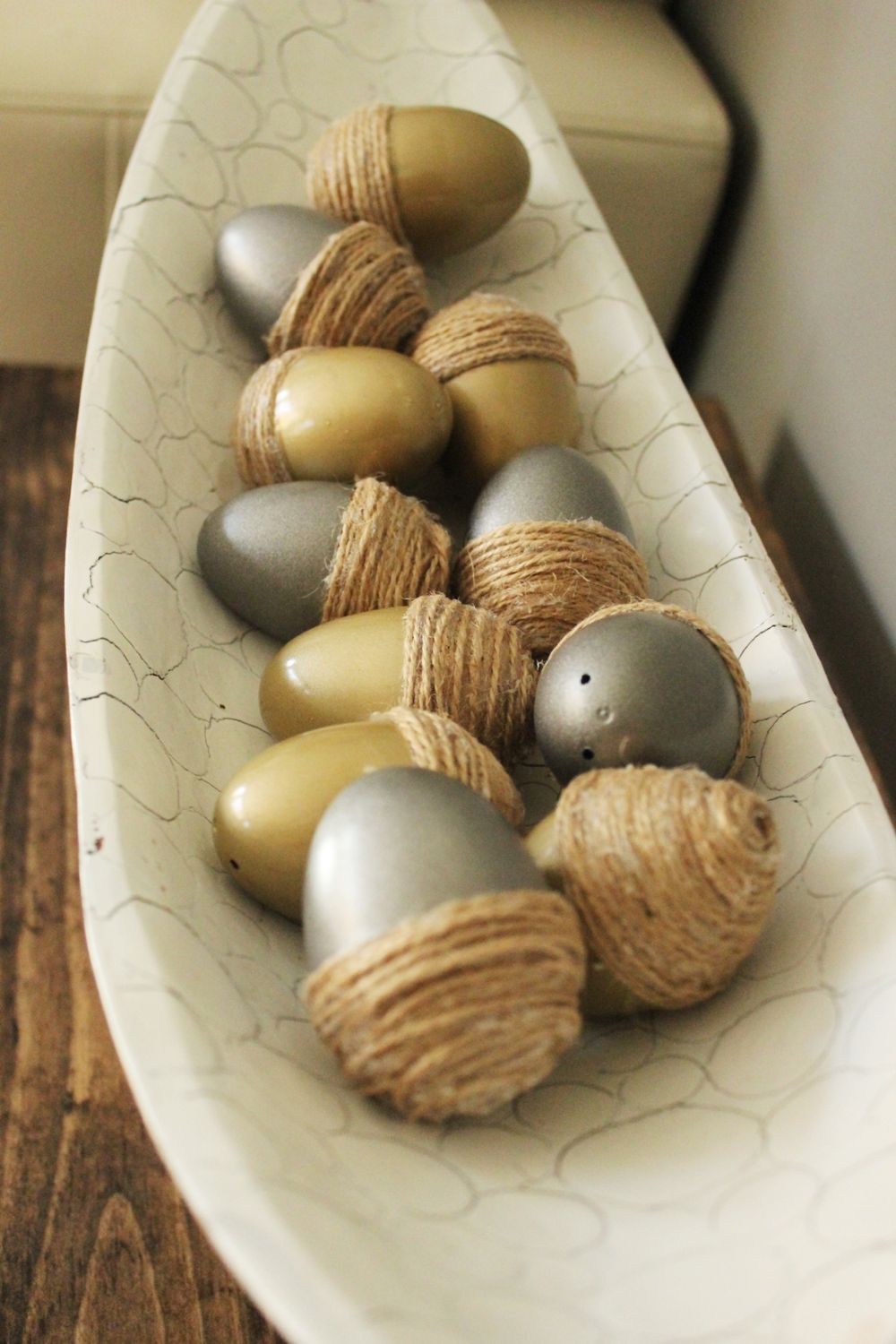 Another cute idea is to make some acorn eggs which you can place in a bowl and turn that into a centerpiece for the dining table or the living room. The project is simple and the supplies needed for it include plastic eggs, jute twine, spray paint and glue. They really do look like giant acorn, don’t they?