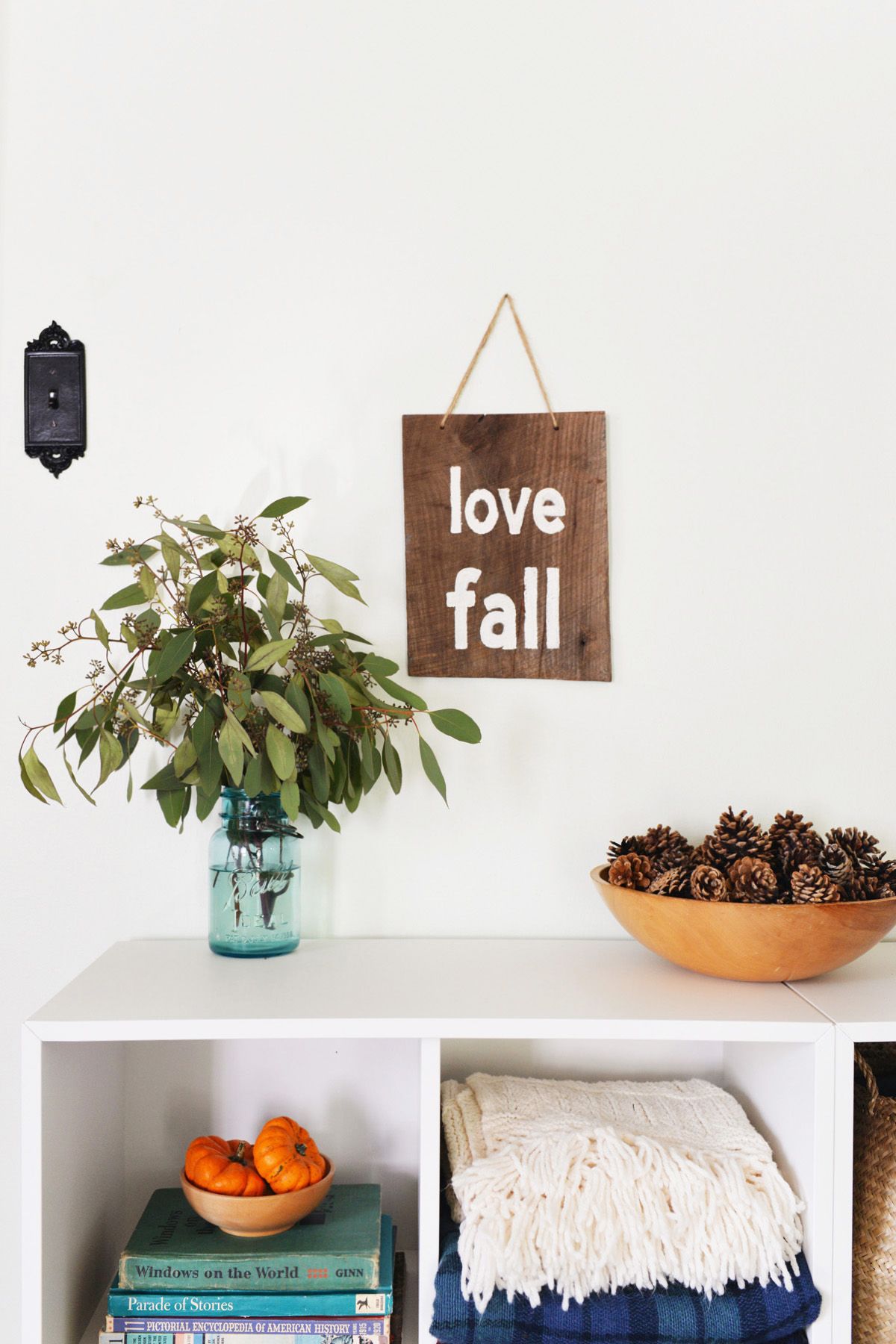 Speaking of fall’s beautiful scents, you might enjoy making some stovetop potpourri using things like cinnamon sticks, orange slices and rosemary. You can put it in glass jars which you can place on shelves or mantles.