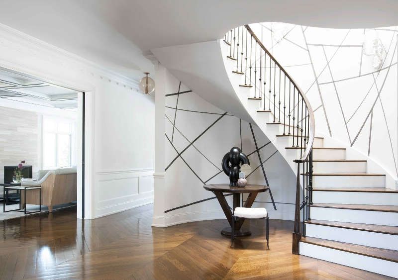 Speaking of simple designs, check out the beautiful home that studio Alison Rose New York created. It takes full advantage of the timeless and elegant influence of the black and white combo. In one case, a floating black table stands between an oversized mirror and the geometric floor tile pattern. The other example features an elegant round table centered in a nook beneath the spiral staircase, complemented by an abstract geometric pattern on the wall.