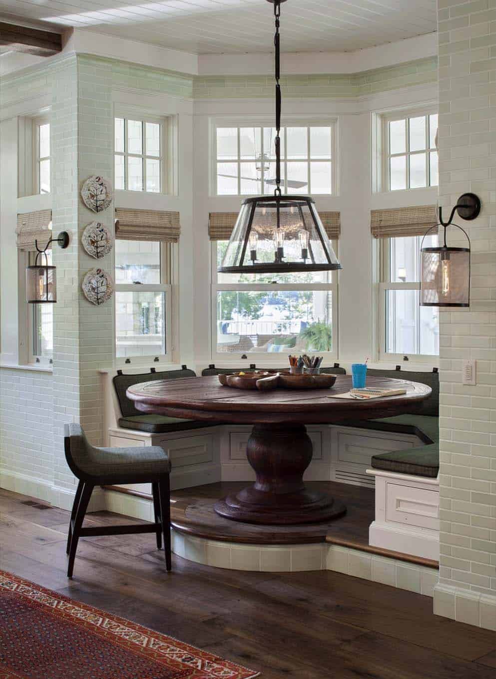 A kitchen nook has the ability to transform the space around it and to make it look and feel more welcoming, more comfortable and more like a social area than just a purely functional space. This one is extra cozy because it has bay windows and doesn’t really interfere with the main floor plan but rather extends beyond, sort of like a little balcony. This is part of a summer home designed by Wade Weissmann Architecture in collaboration with Robert Alt Design.